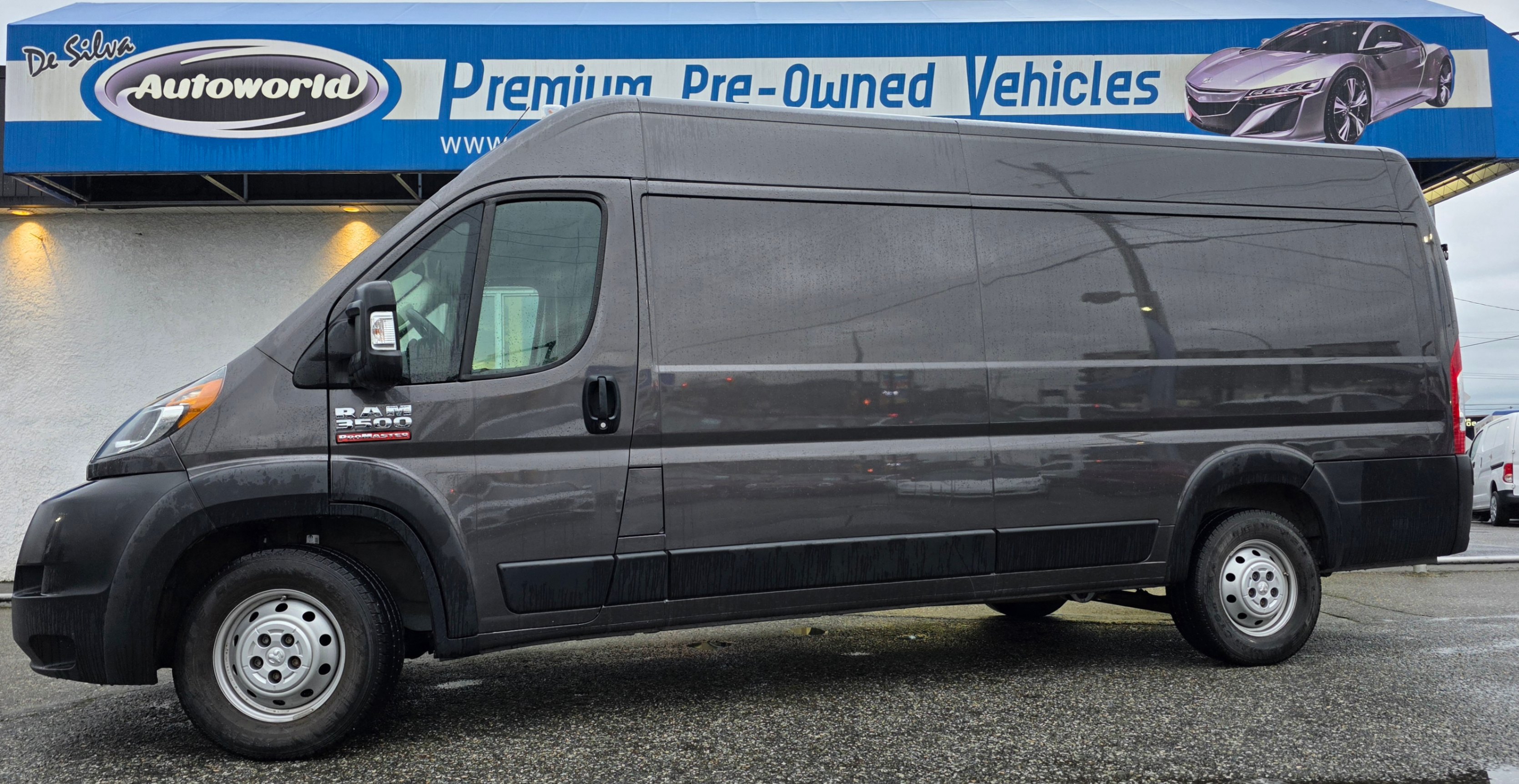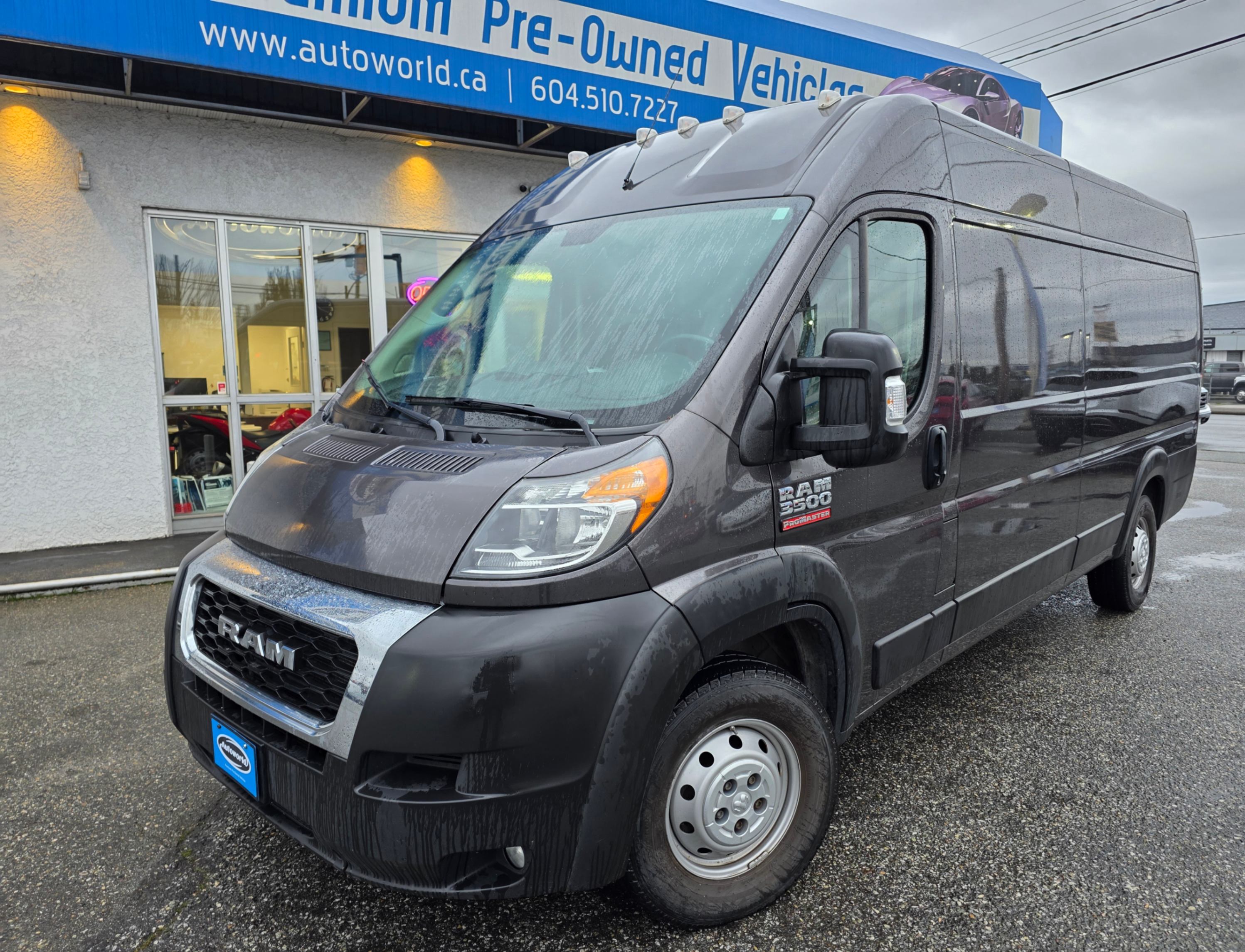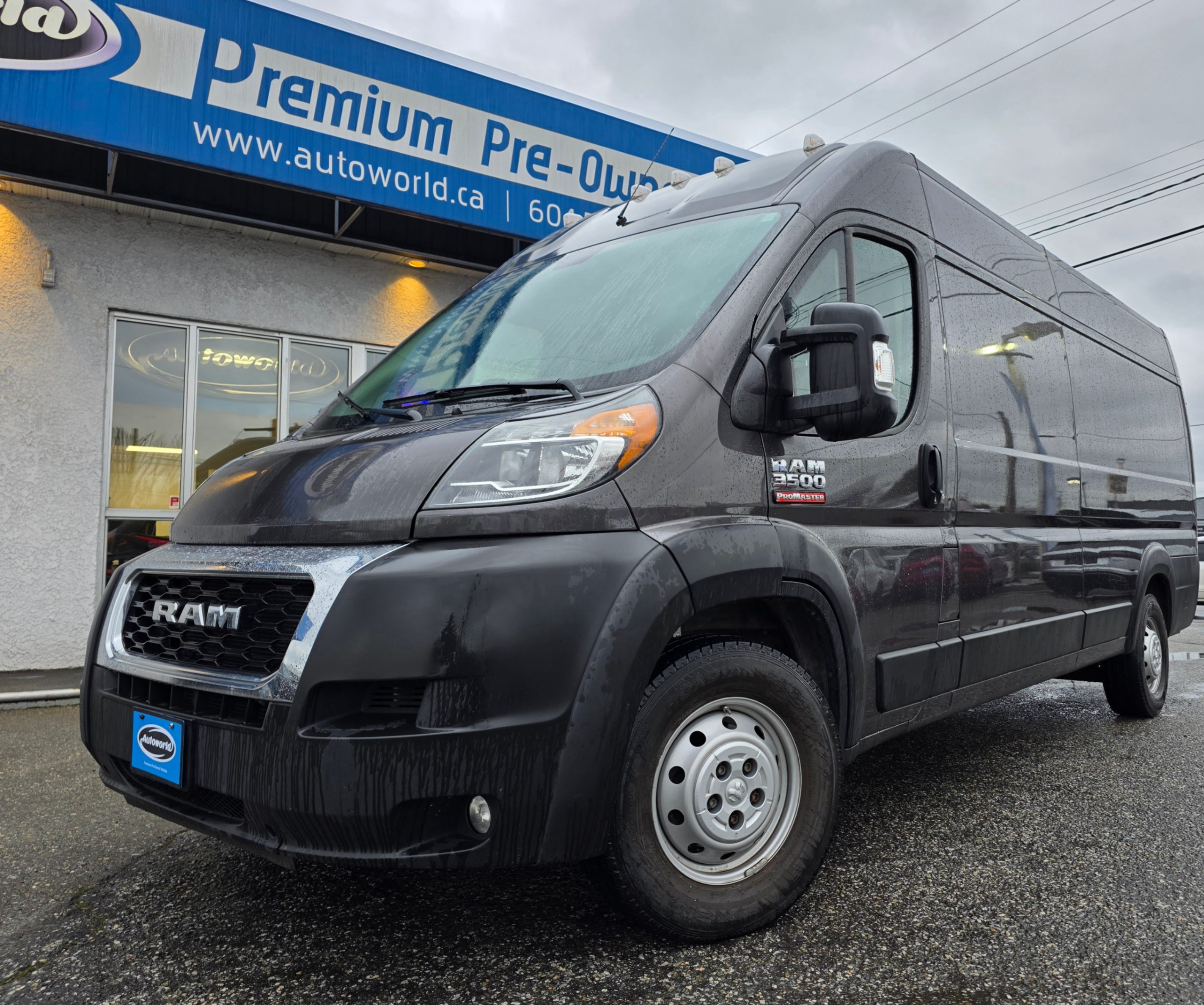 This vehicle is a 2021 Ram 3500 ProMaster Cargo Van with a 159" WB Extended wheelbase. It is finished in Granite Crystal Metallic with a Black interior and Black seats. This is a one-owner vehicle with 59,000kms.