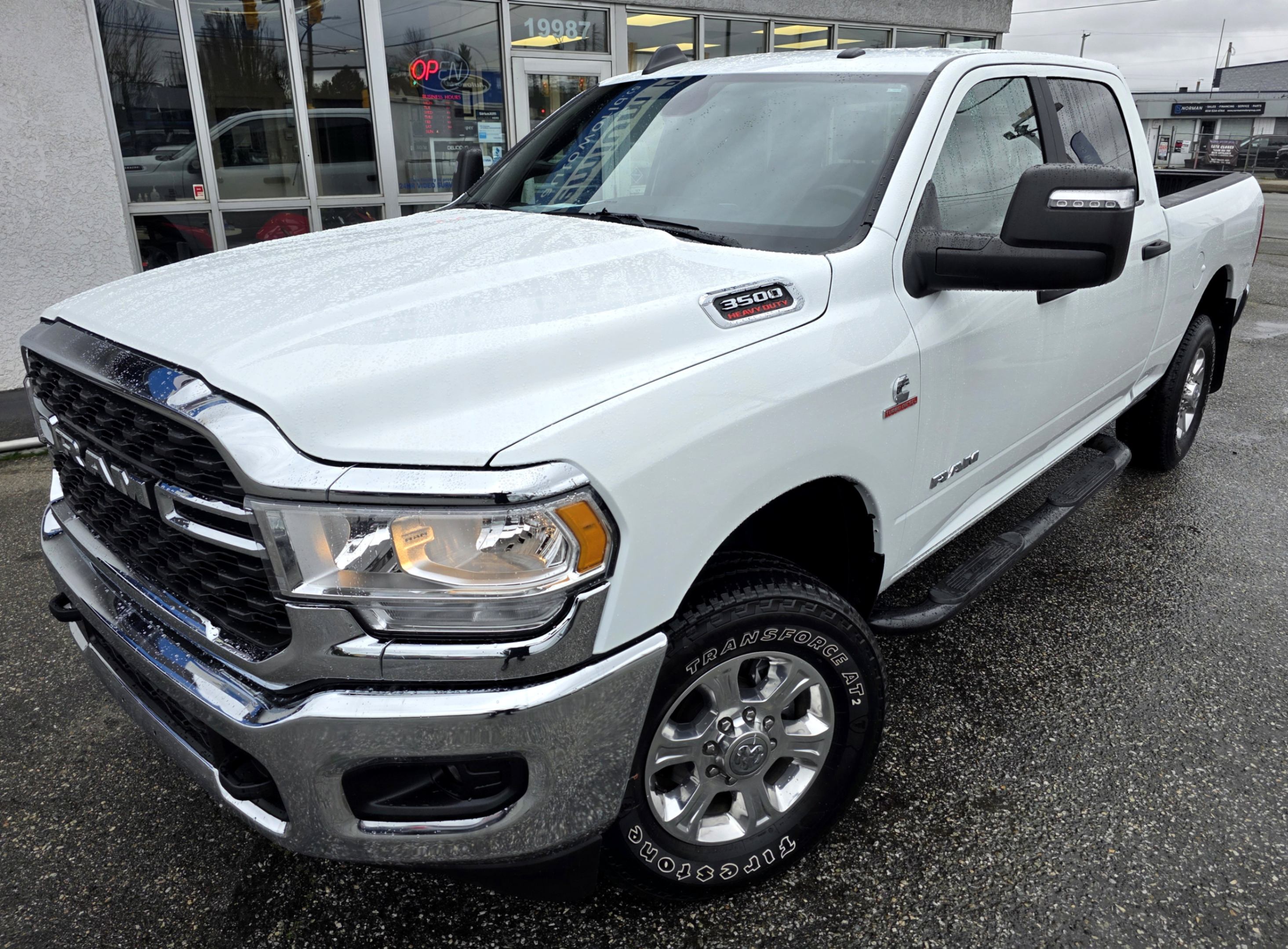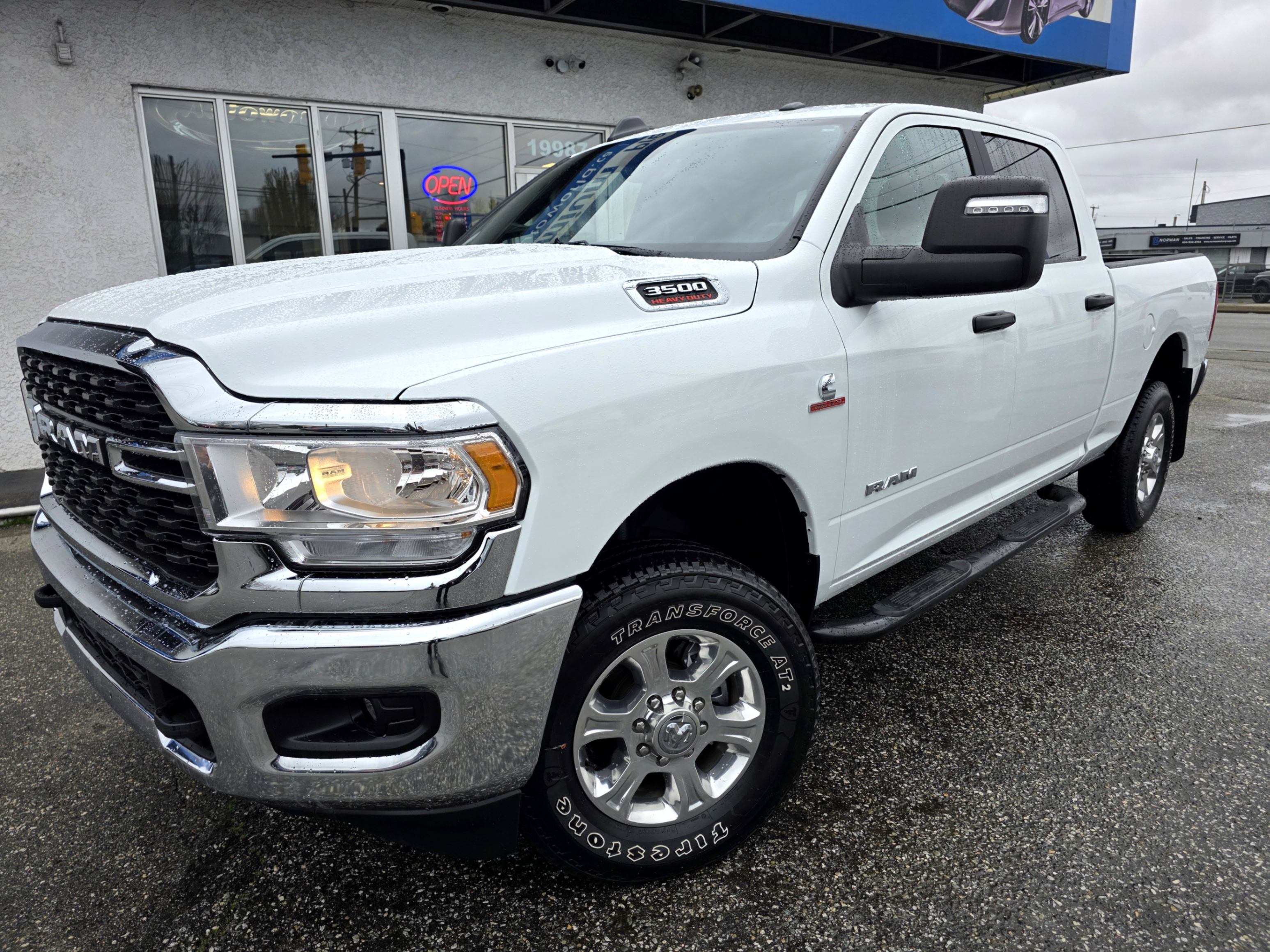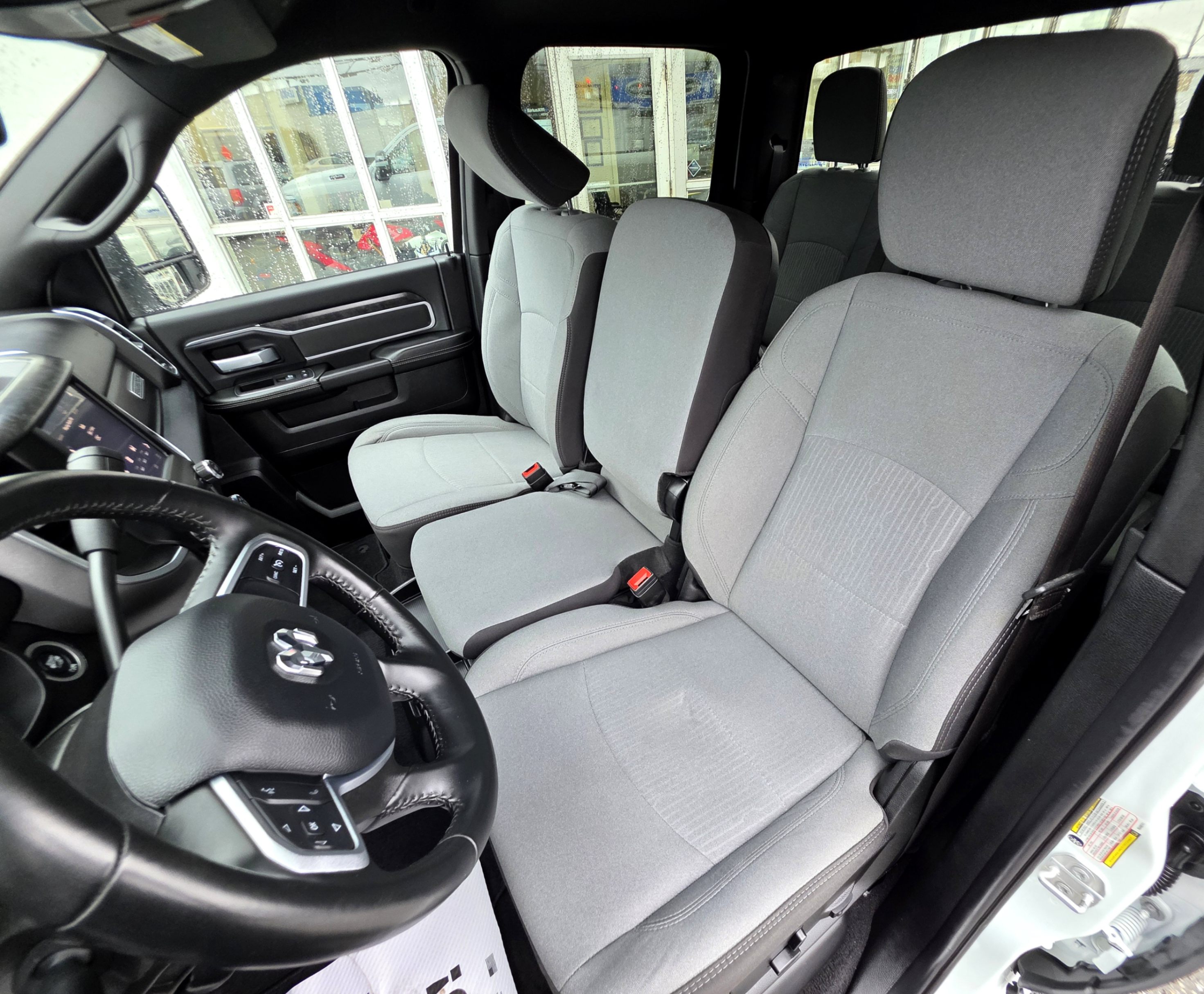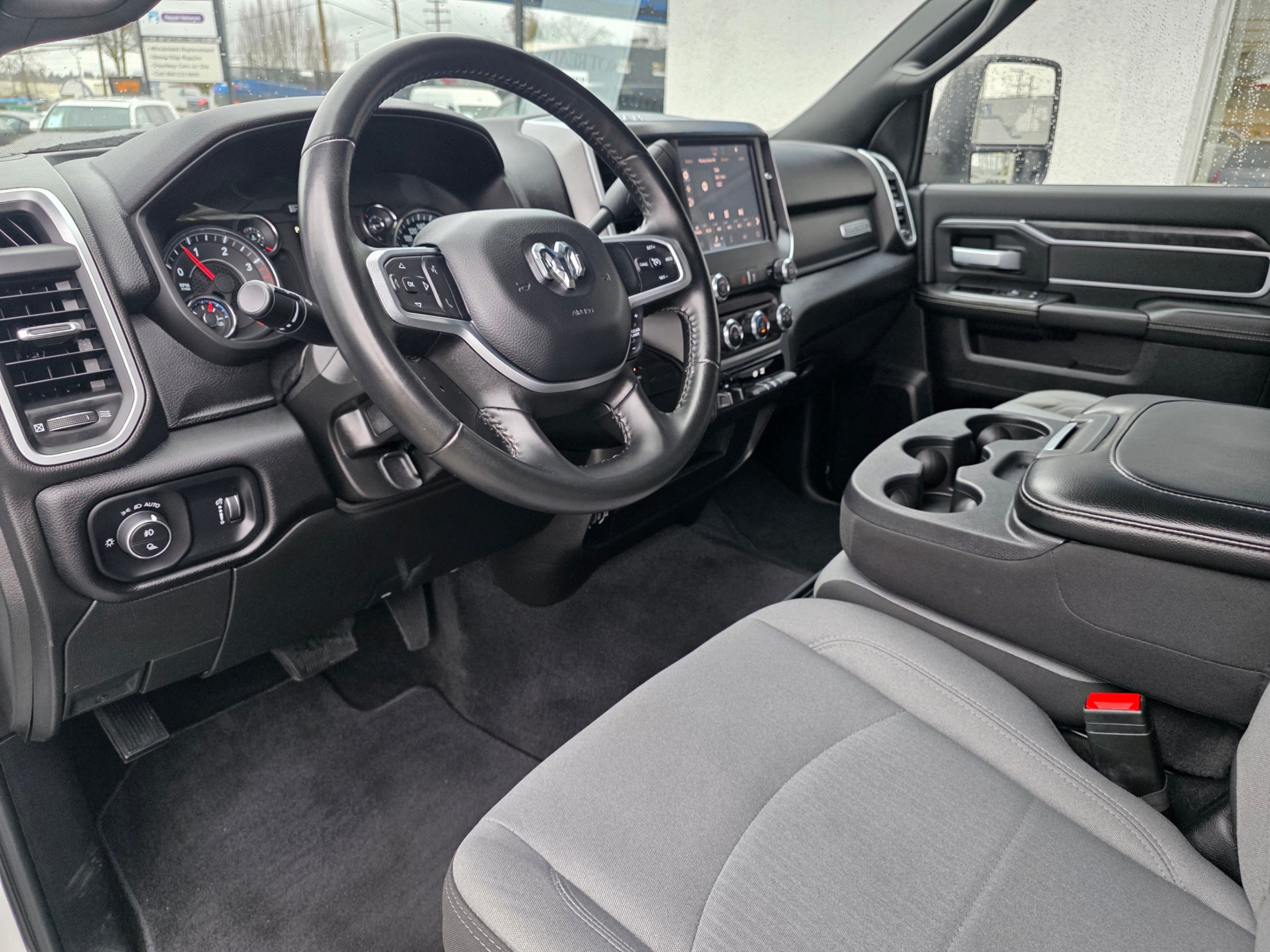 Experience the pinnacle of heavy-duty performance with this pristine 2024 RAM 3500 Big Horn Crew Cab 4x4. Finished in a striking Bright White with a sophisticated Black and Diesel Grey premium cloth interior, this truck offers a commanding presence on any road.